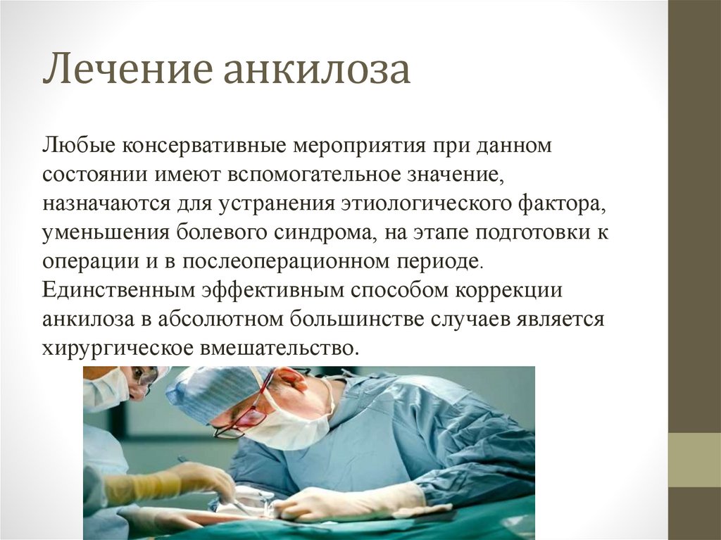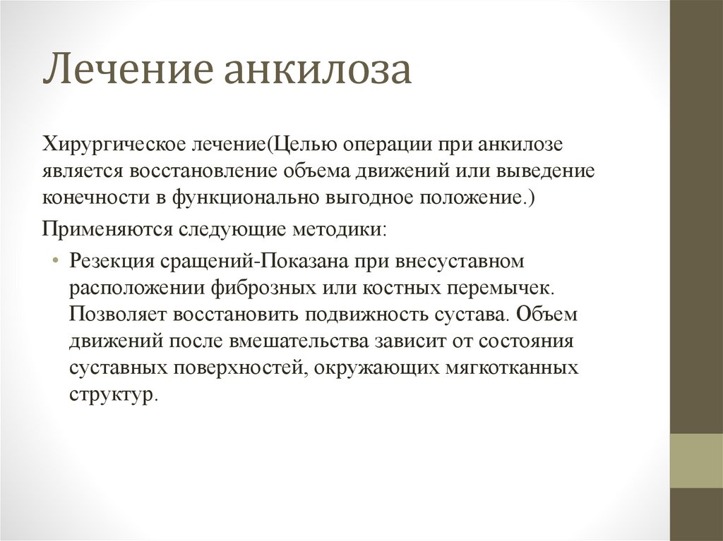 Лечение анкилозаХирургическое лечение(Целью операции при анкилозе