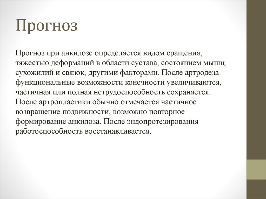 ПрогнозПрогноз при анкилозе определяется видом сращения,