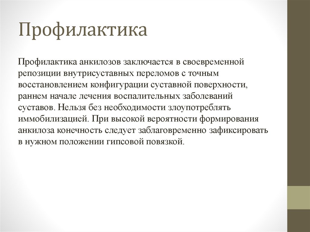ПрофилактикаПрофилактика анкилозов заключается в своевременной