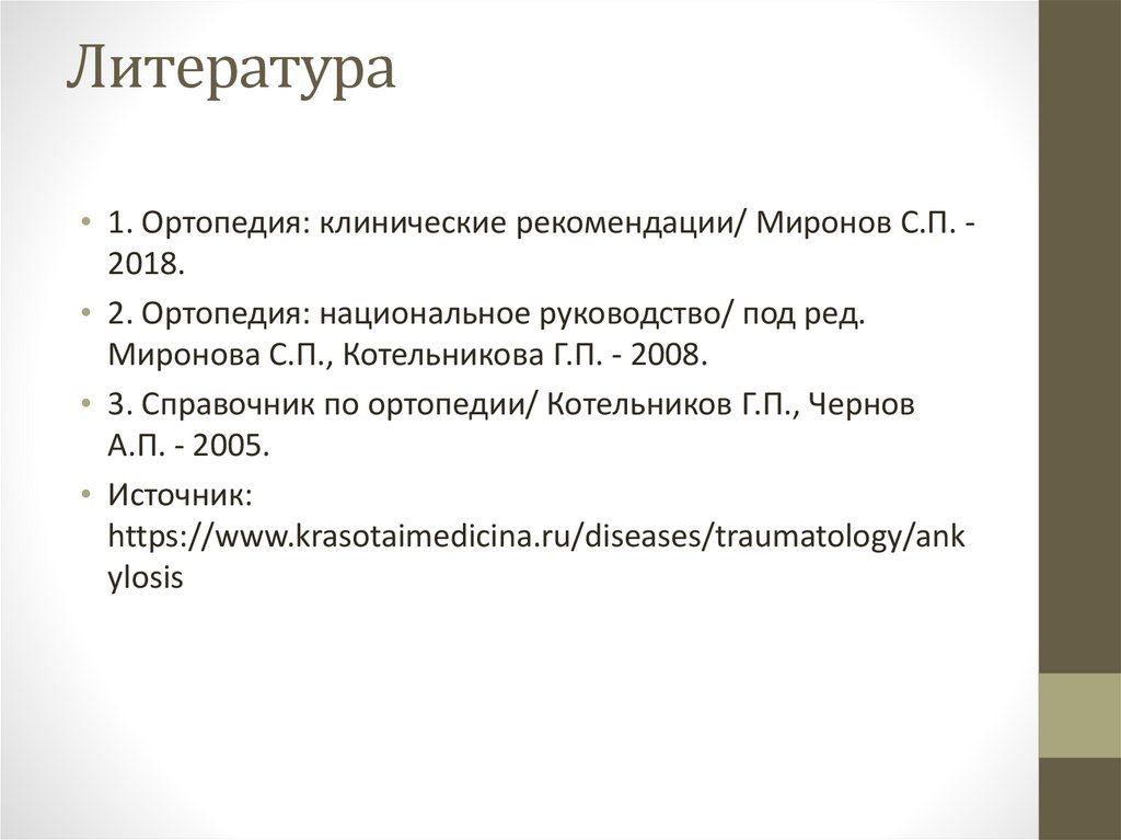 Литература• 1. Ортопедия: клинические рекомендации/ Миронов С.П. 2018.