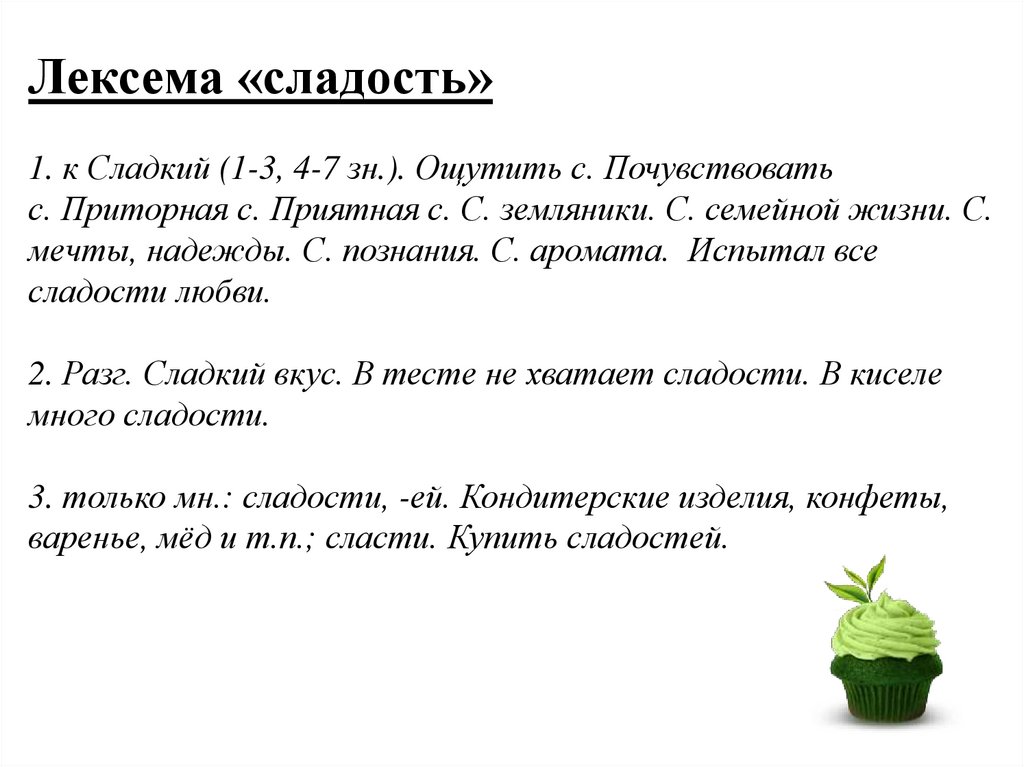 Лексема «сладость»1. к Сладкий (1-3, 4-7 зн.). Ощутить с. Почувствовать