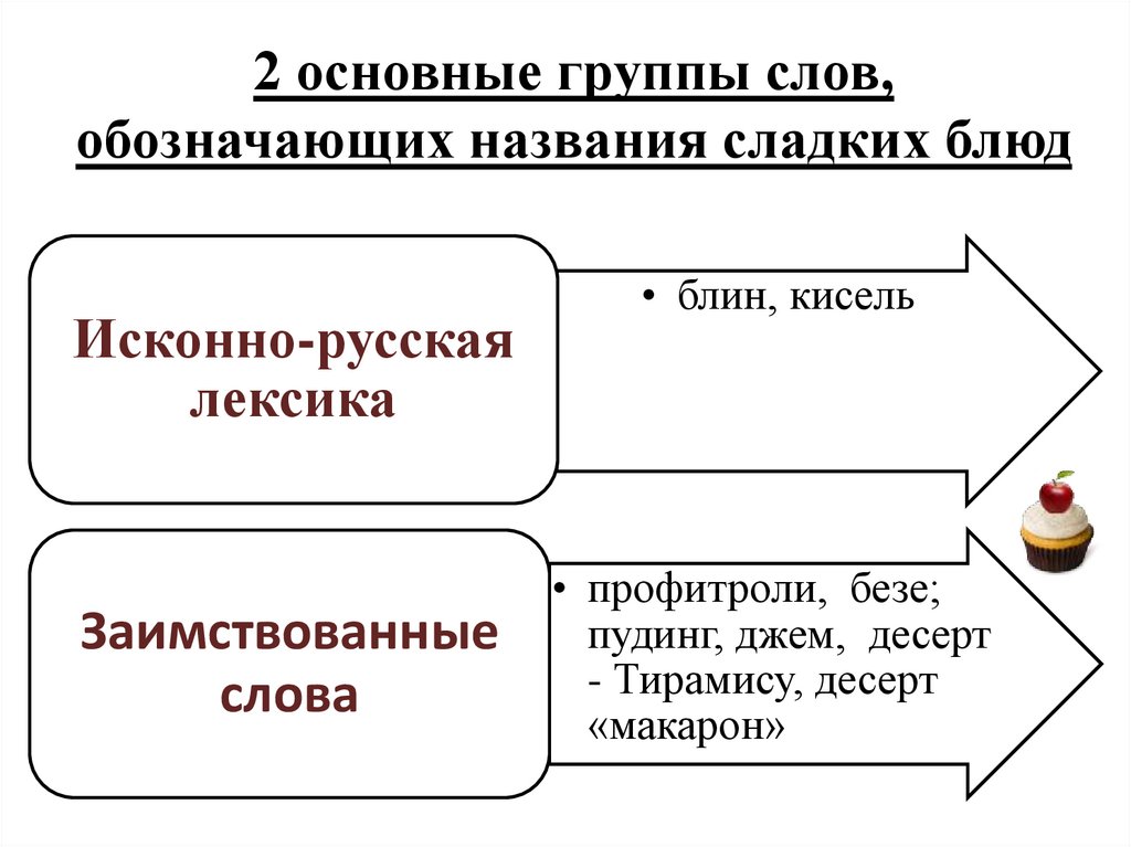 2 основные группы слов,обозначающих названия сладких блюд