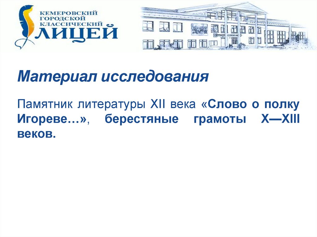 Материал исследованияПамятник литературы XII века «Слово о полку