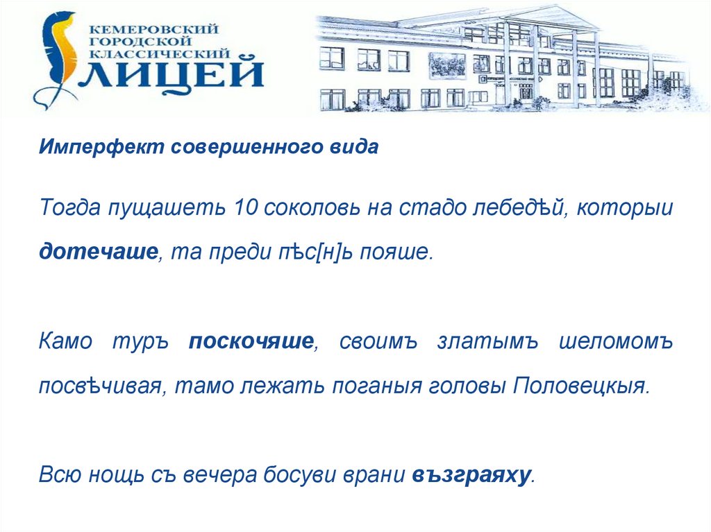 Имперфект совершенного видаТогда пущашеть 10 соколовь на стадо лебедѣй, которыи