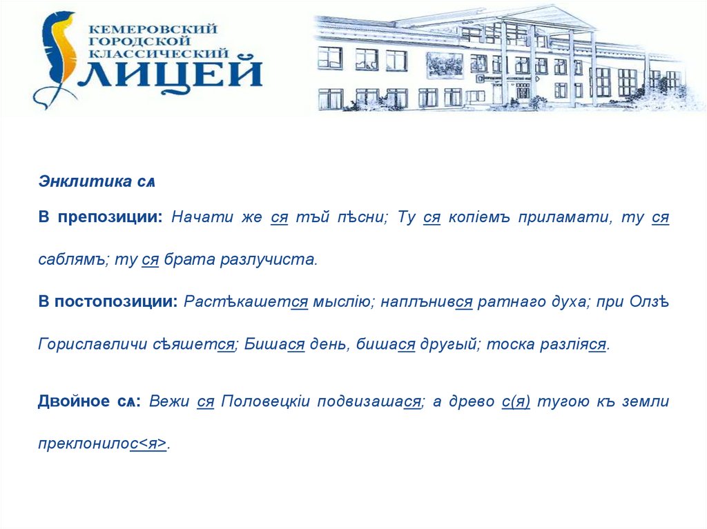 Энклитика сѧВ препозиции: Начати же ся тъй пѣсни; Ту ся копіемъ приламати, ту ся