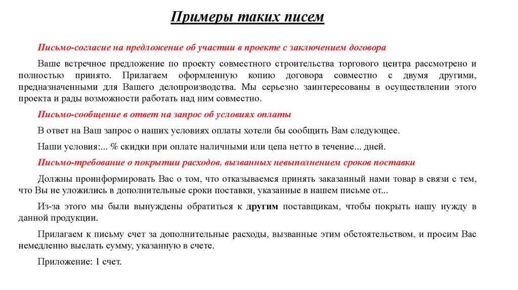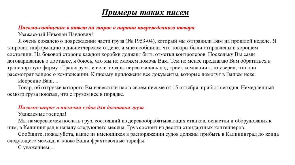 Примеры таких писемПисьмо-сообщение в ответ на запрос о партии поврежденного товара