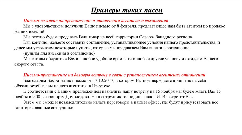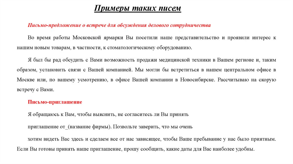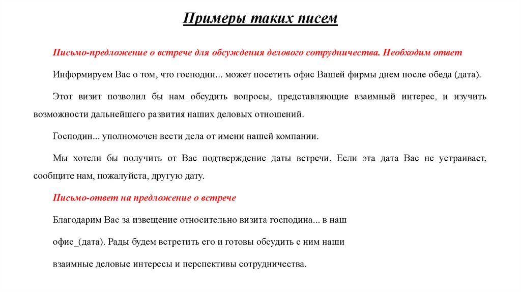 Примеры таких писемПисьмо-предложение о встрече для обсуждения делового сотрудничества