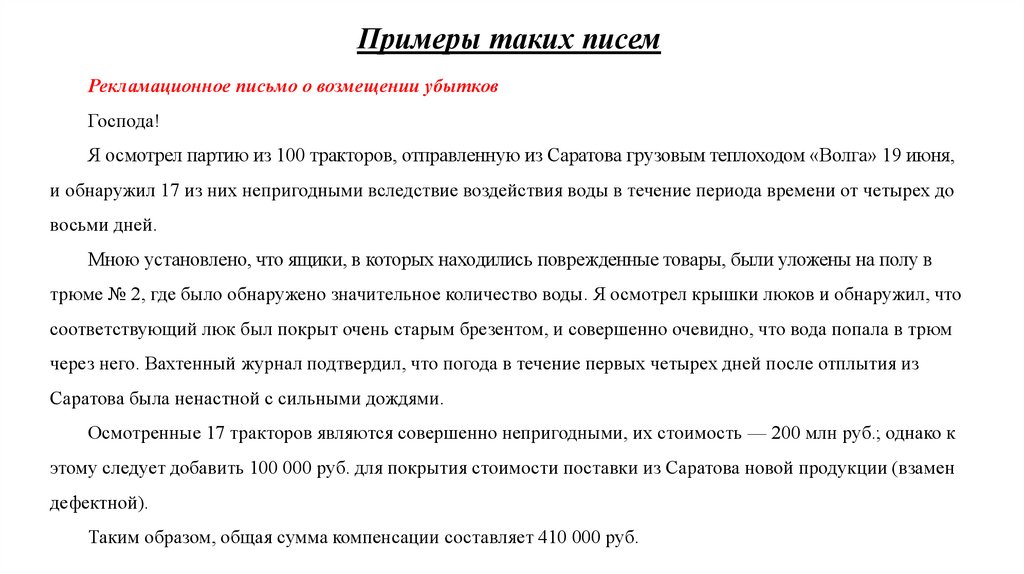 Примеры таких писемРекламационное письмо о возмещении убытков