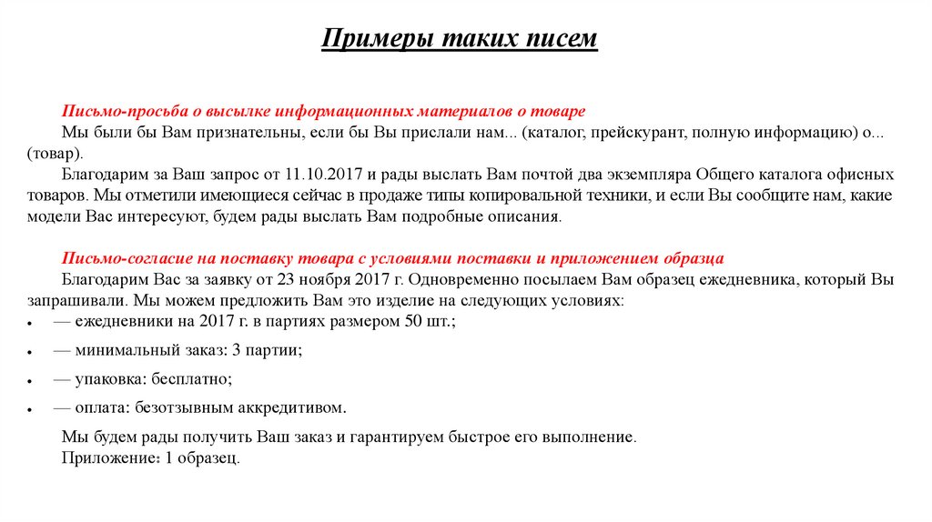Примеры таких писемПисьмо-просьба о высылке информационных материалов о товаре