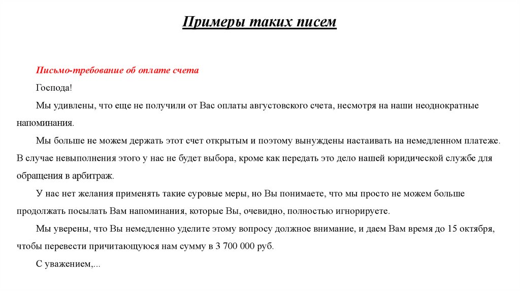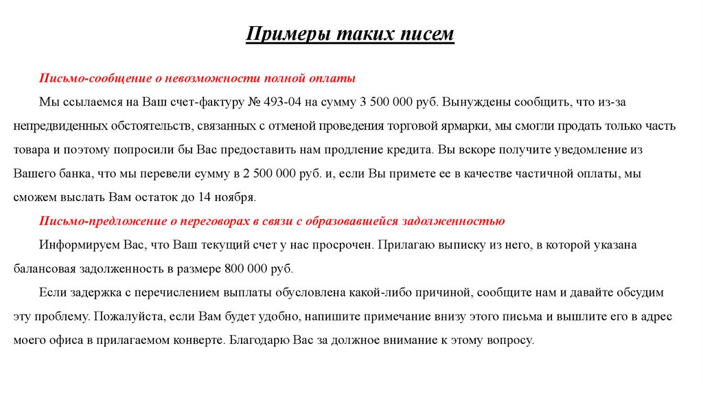 Примеры таких писемПисьмо-сообщение о невозможности полной оплаты