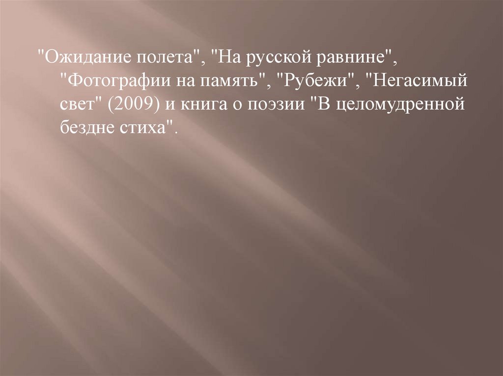"Ожидание полета", "На русской равнине","Фотографии на память", "Рубежи", "Негасимый