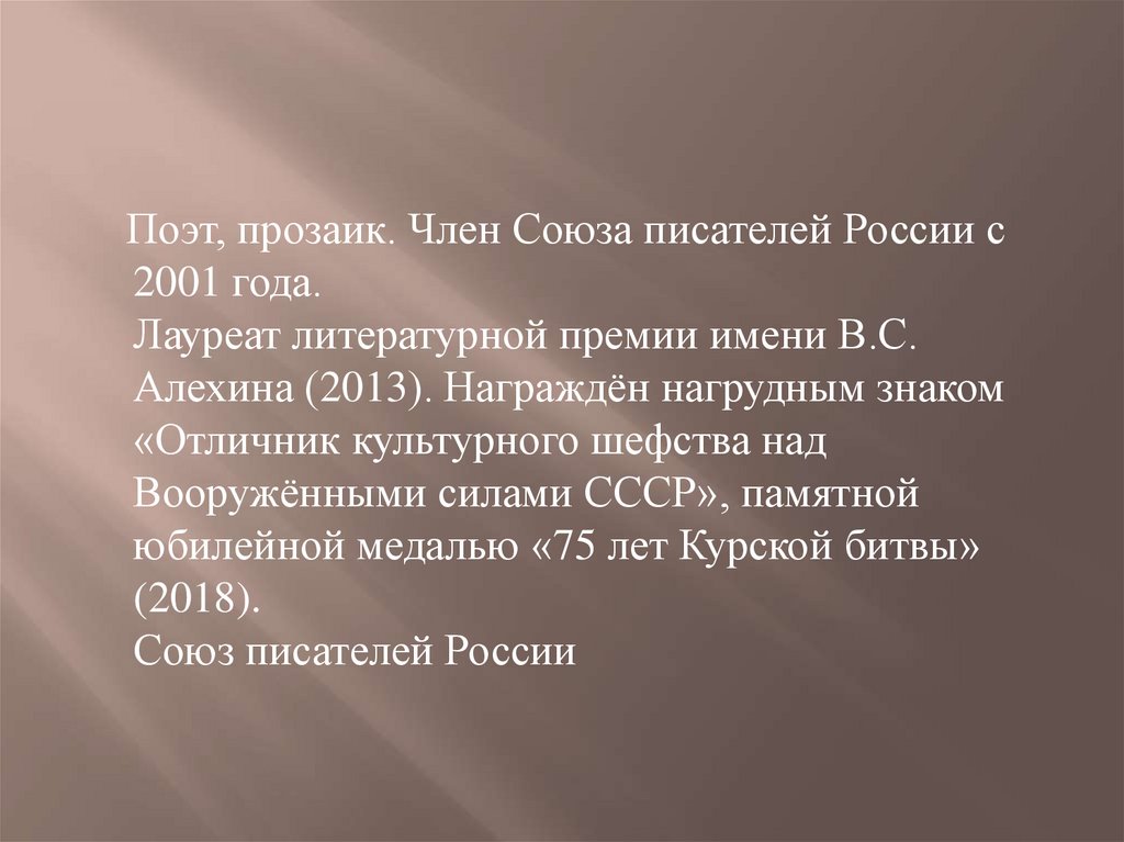 Поэт, прозаик. Член Союза писателей России с2001 года.