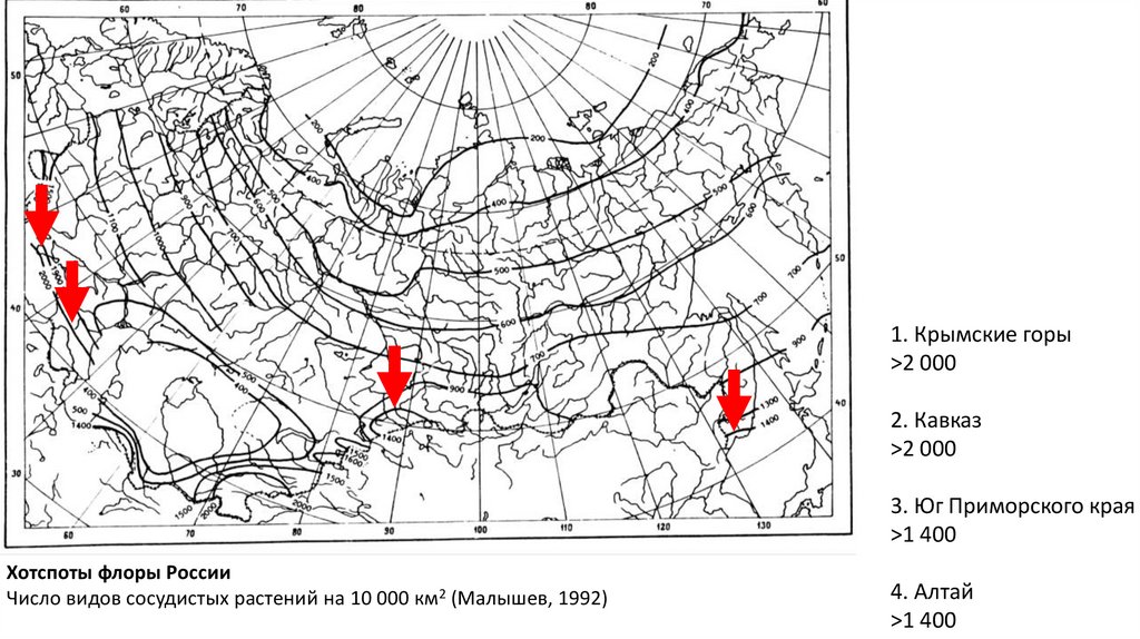 Число видов сосудистых растений на 10 000 км2 (Малышев, 1992)