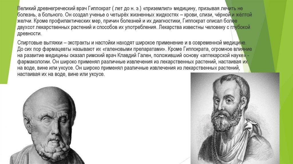 До сих пор фармацевты называют их «галеновыми препаратами». Кроме Гиппократа, огромное влияние