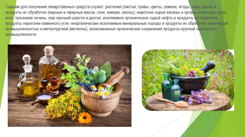 Сырьём для получения лекарственных средств служат: растения (листья, травы, цветы, семена, ягоды, кора, корни) ипродукты их обработки (жирные и эфирные масла, соки, камеди, смолы); животное сырьё железы и органы животных, сало,