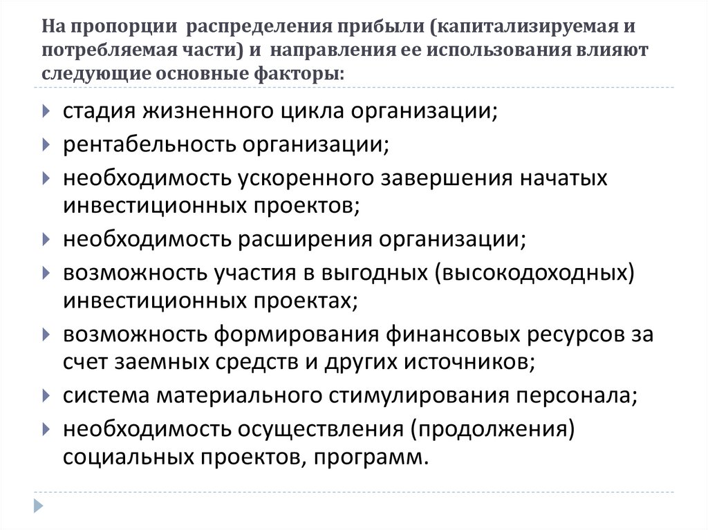 На пропорции распределения прибыли (капитализируемая ипотребляемая части) и направления ее использования влияют