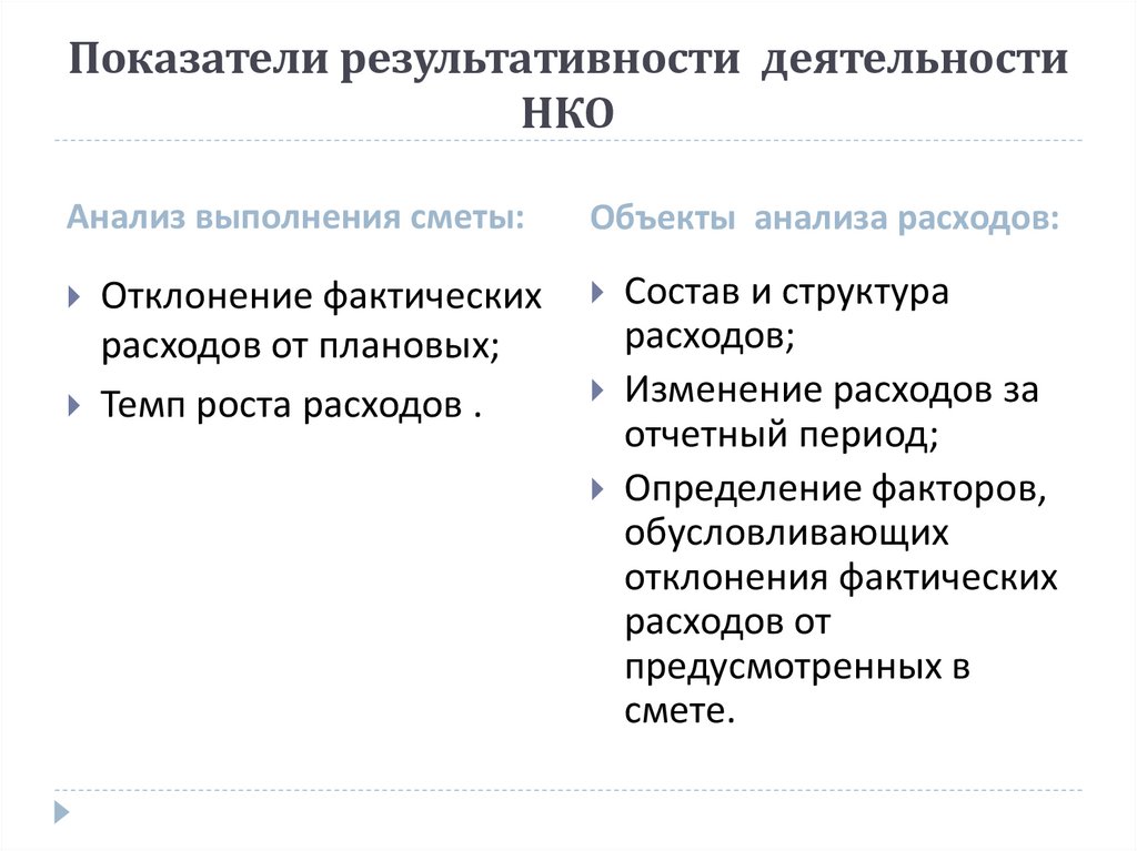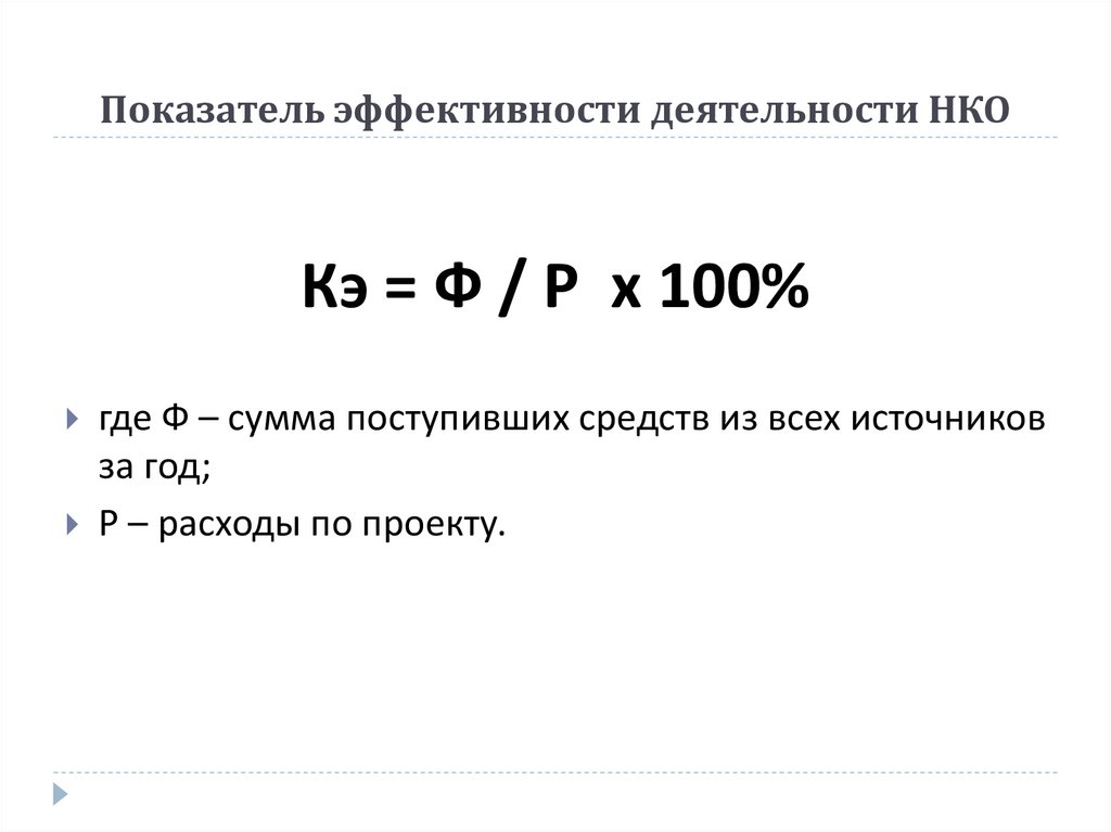 Показатель эффективности деятельности НКОКэ = Ф / Р х 100%