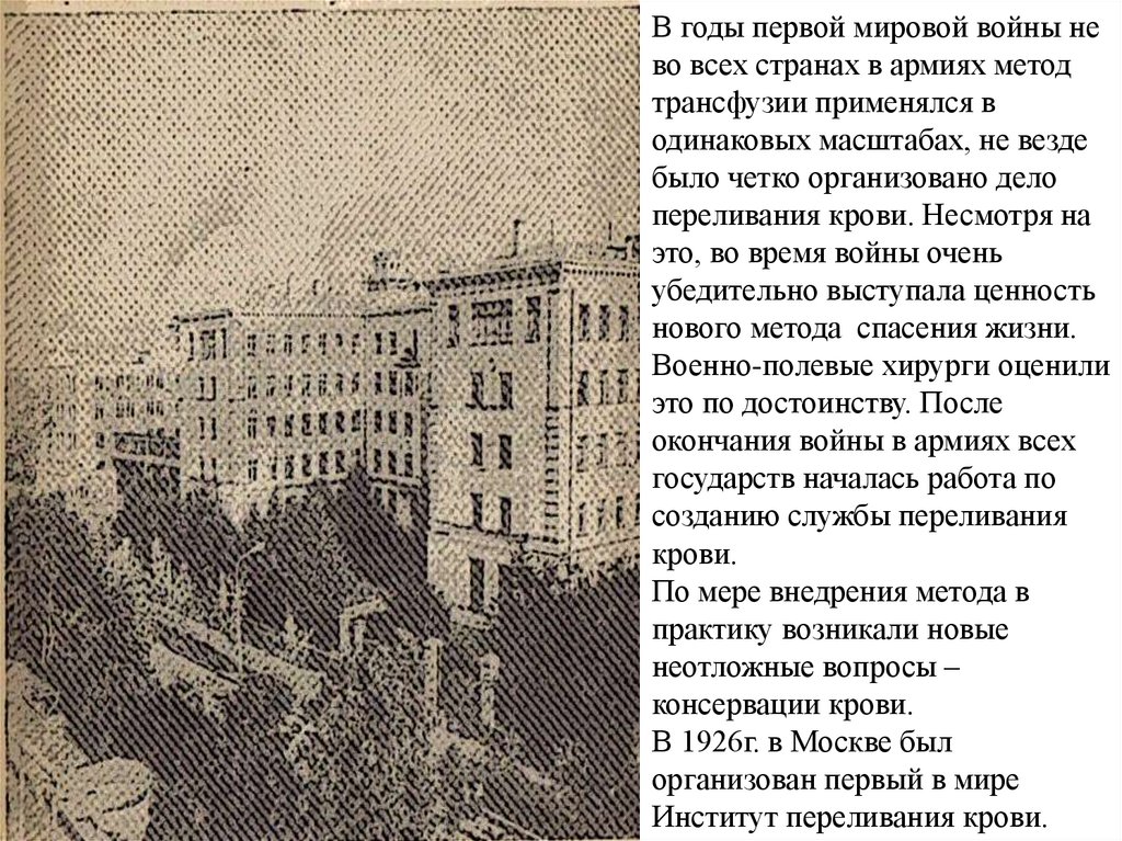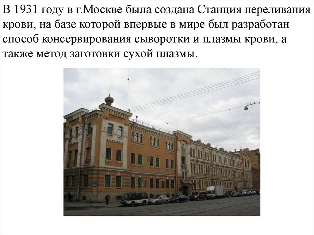 В 1931 году в г.Москве была создана Станция переливаниякрови, на базе которой впервые в мире был разработан