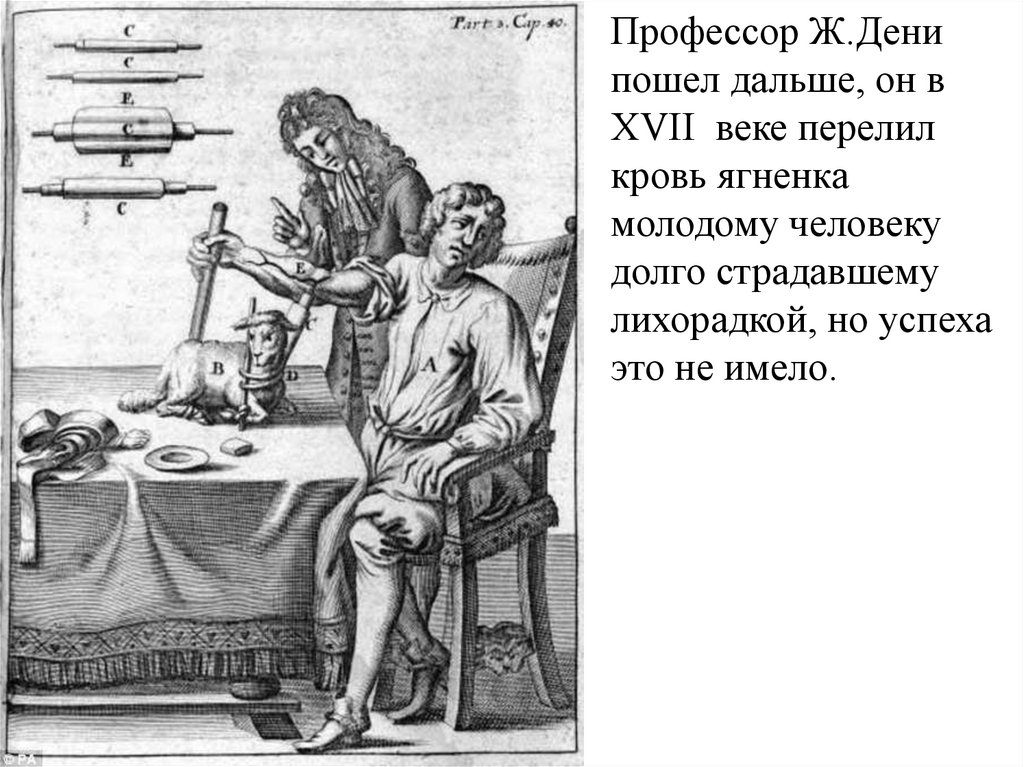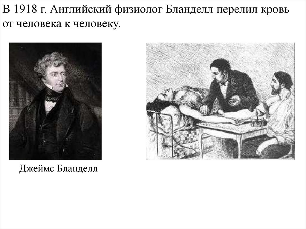 В 1918 г. Английский физиолог Бланделл перелил кровьот человека к человеку.