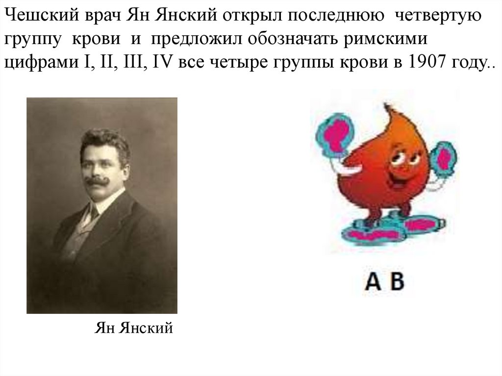 Чешский врач Ян Янский открыл последнюю четвертуюгруппу крови и предложил обозначать римскими