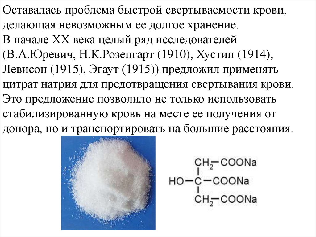 Оставалась проблема быстрой свертываемости крови,делающая невозможным ее долгое хранение.