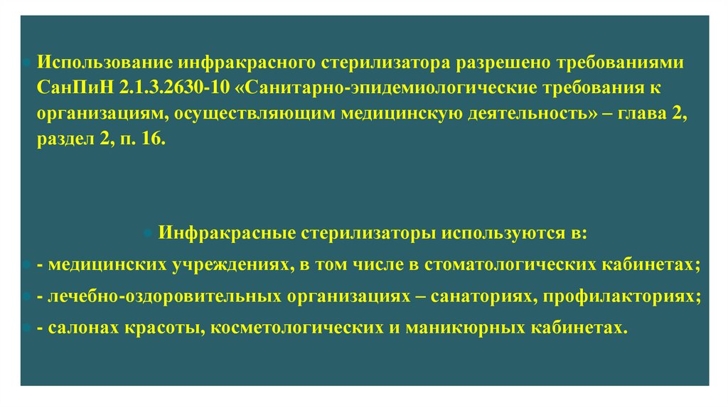 ● Использование инфракрасного стерилизатора разрешено требованиямиСанПиН 2.1.3.2630-10 «Санитарно-эпидемиологические требования к