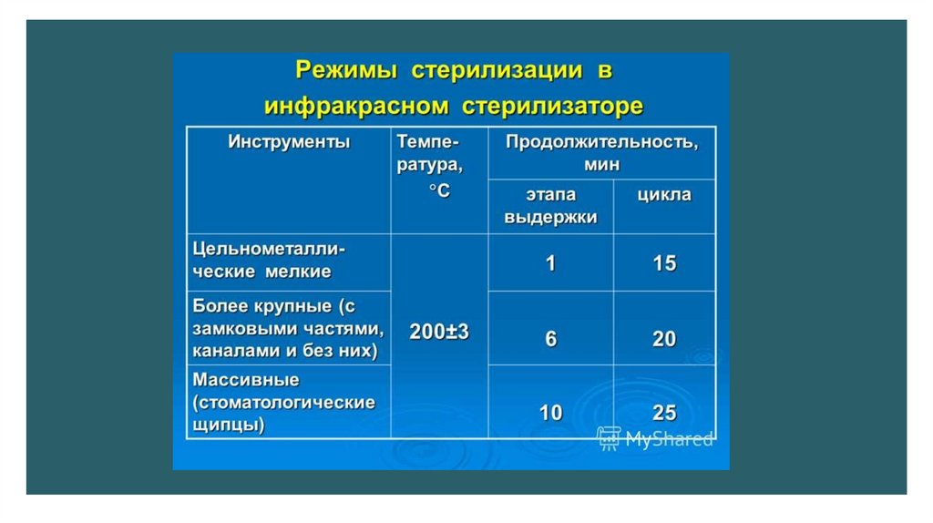 инструментов в неупакованном виде занимает в инфракрасном стерилизаторе от 10 до 25 мин (в