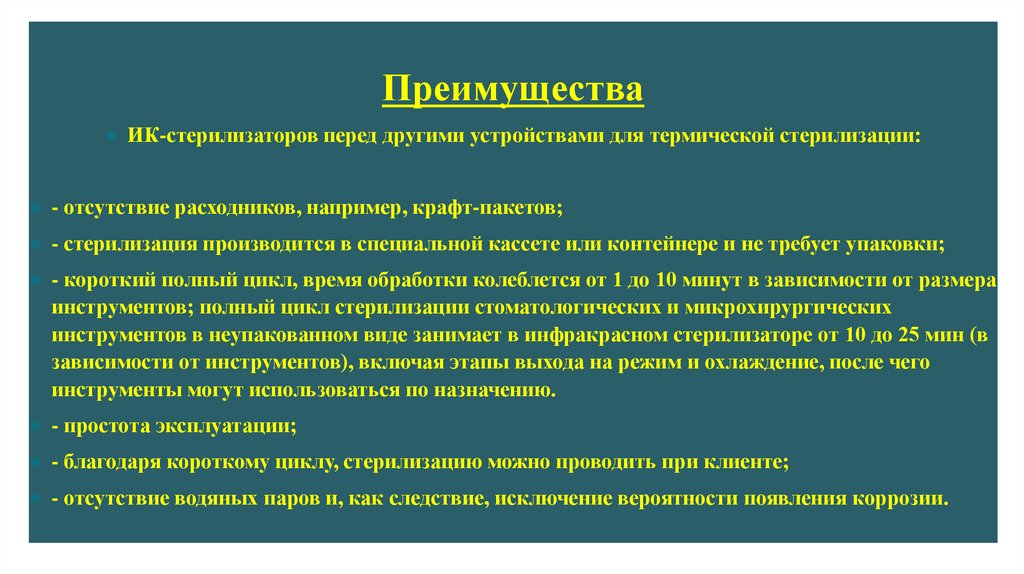 Преимущества● ИК-стерилизаторов перед другими устройствами для термической стерилизации: