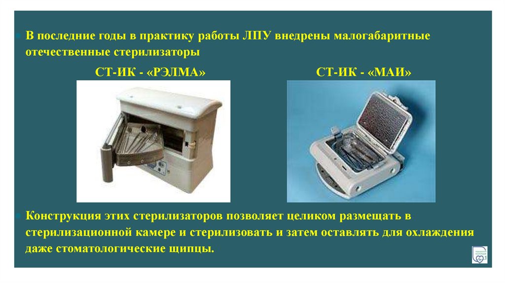 ● В последние годы в практику работы ЛПУ внедрены малогабаритныеотечественные стерилизаторы