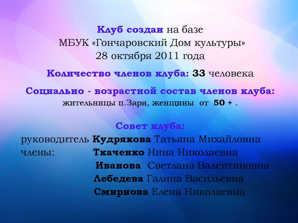 Клуб создан на базеМБУК «Гончаровский Дом культуры»