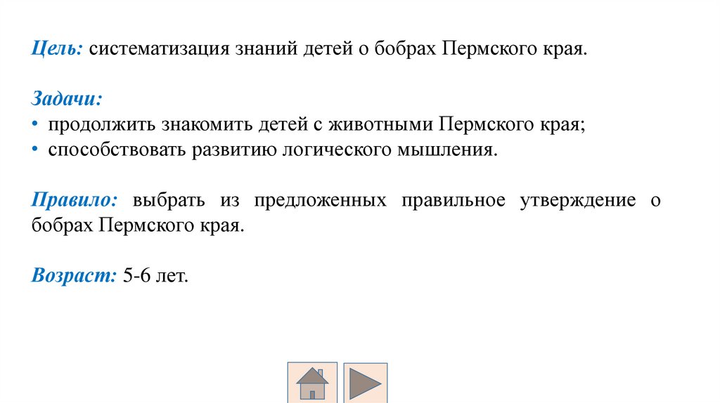 Цель: систематизация знаний детей о бобрах Пермского края.