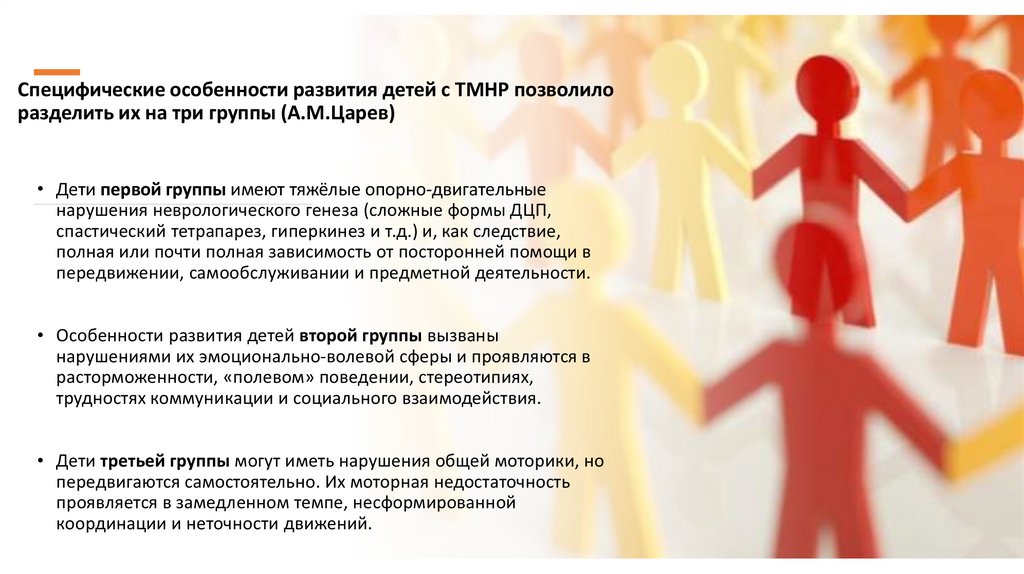 Специфические особенности развития детей с ТМНР позволилоразделить их на три группы (А.М.Царев)