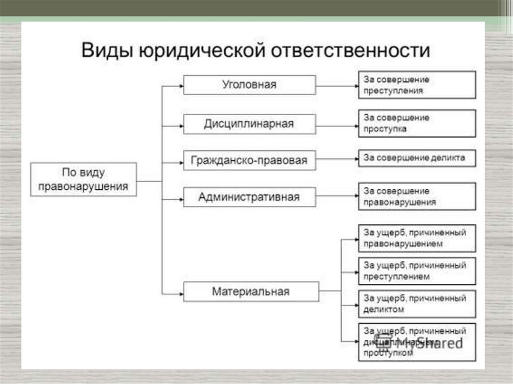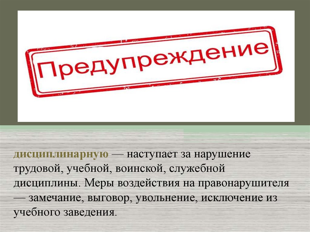 дисциплинарную — наступает за нарушениетрудовой, учебной, воинской, служебной