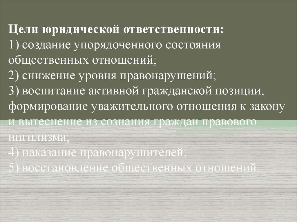 Цели юридической ответственности:1) создание упорядоченного состояния