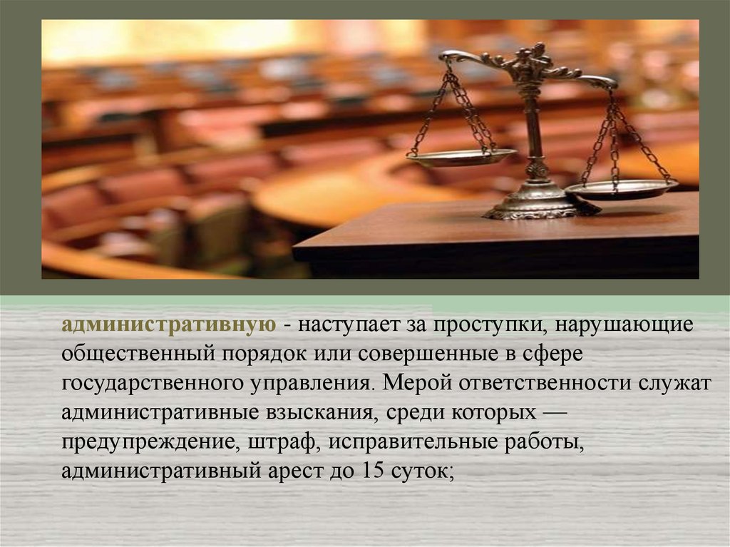 административную - наступает за проступки, нарушающиеобщественный порядок или совершенные в сфере