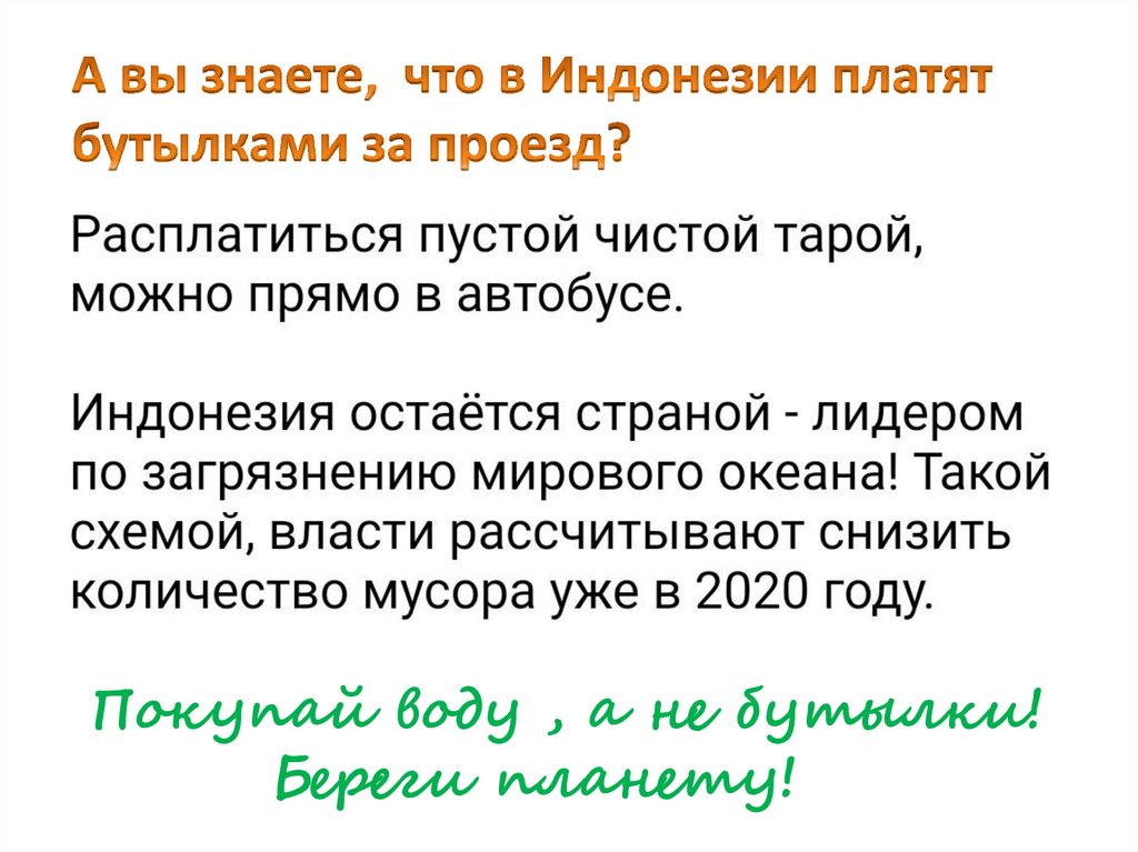 Покупай воду , а не бутылки!Береги планету!