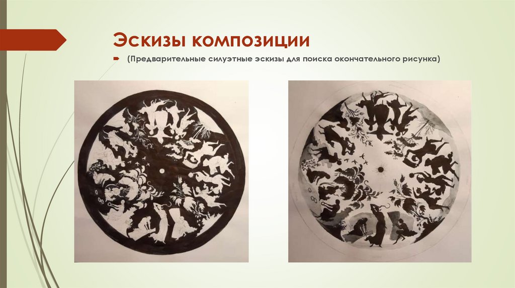 Эскизы композиции(Предварительные силуэтные эскизы для поиска окончательного рисунка)