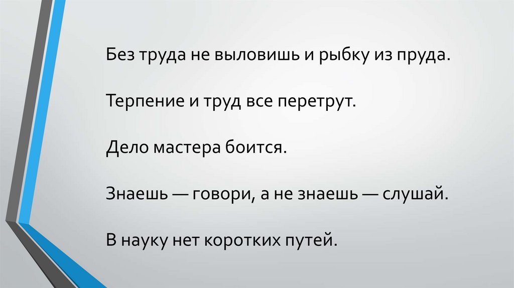 Без труда не выловишь и рыбку из пруда.Терпение и труд все перетрут.