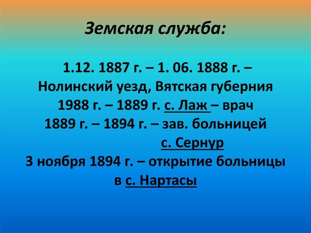 Земская служба:1.12. 1887 г. – 1. 06. 1888 г. –