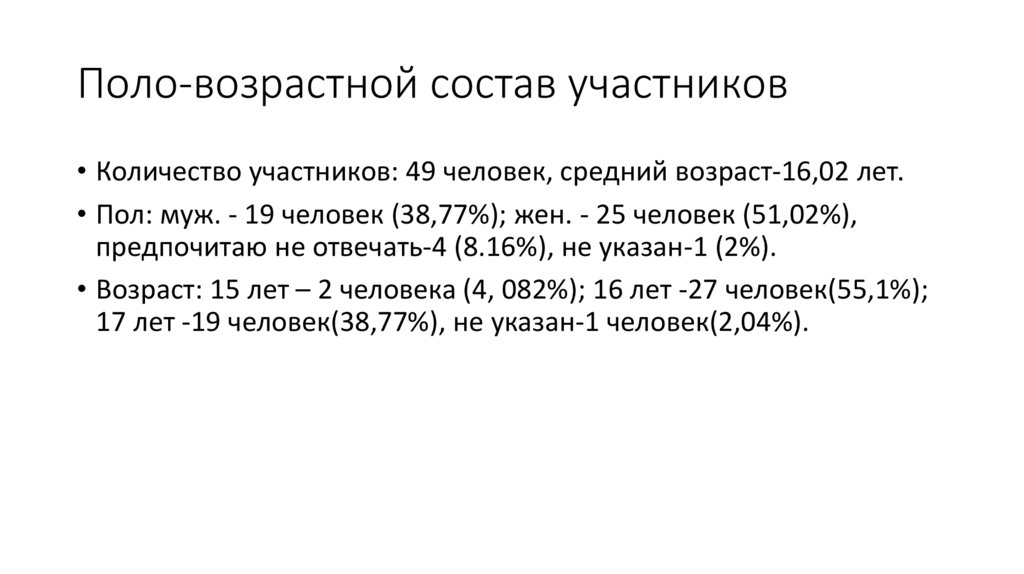 Поло-возрастной состав участников• Количество участников: 49 человек, средний возраст-16,02 лет.