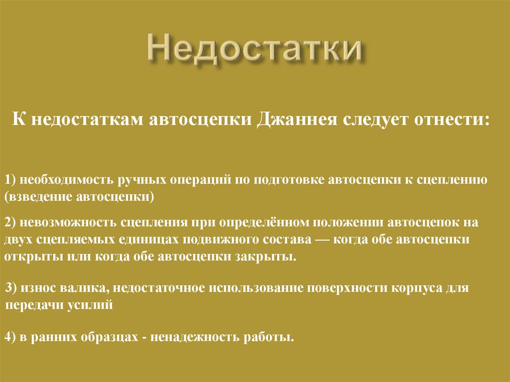 К недостаткам автосцепки Джаннея следует отнести:1) необходимость ручных операций по подготовке автосцепки к сцеплению