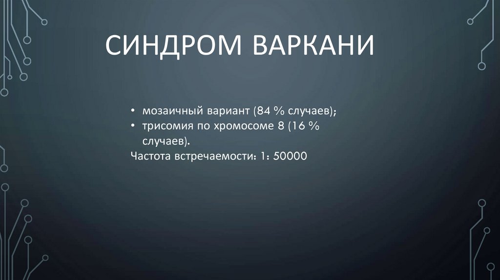 СИНДРОМ ВАРКАНИ• мозаичный вариант (84 % случаев);