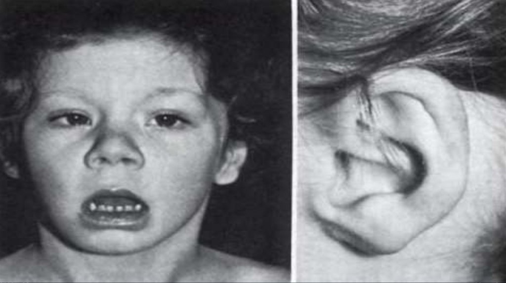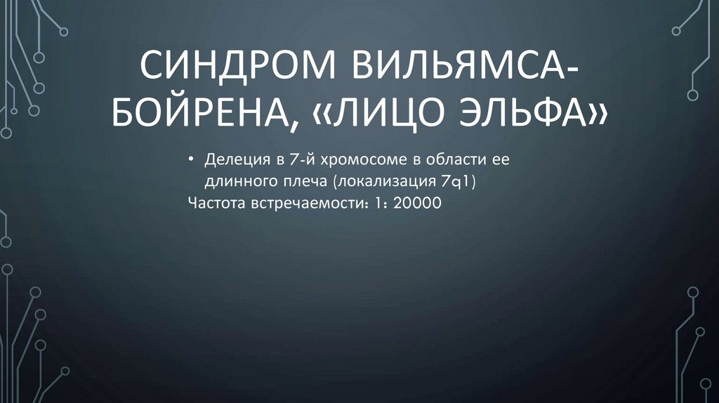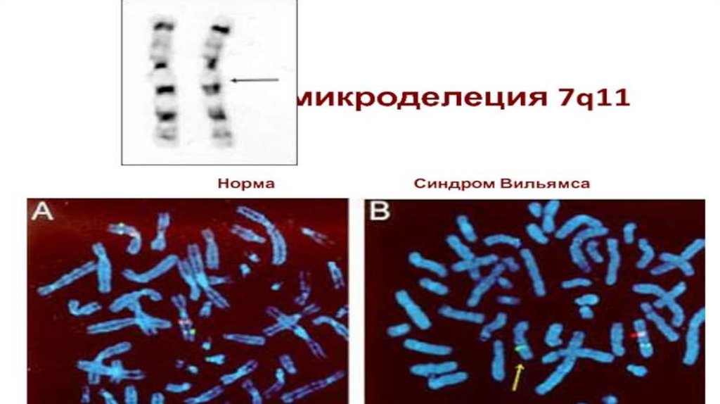 СИНДРОМ ВИЛЬЯМСАБОЙРЕНА, «ЛИЦО ЭЛЬФА»• Делеция в 7-й хромосоме в области ее