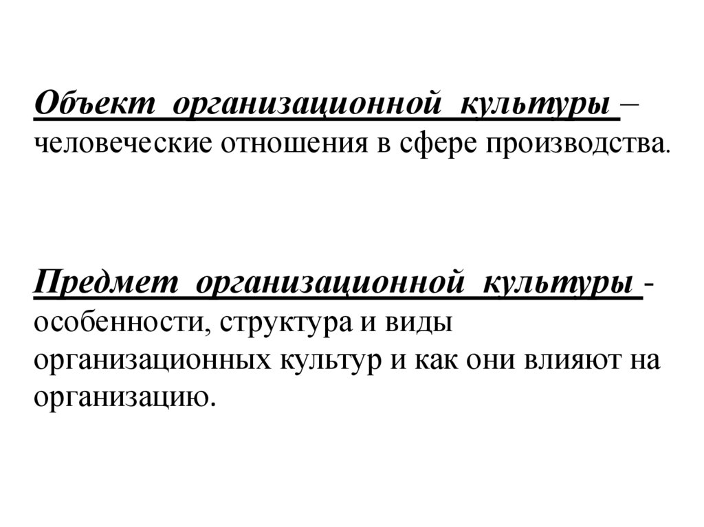 Объект организационной культуры –человеческие отношения в сфере производства.