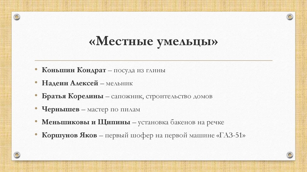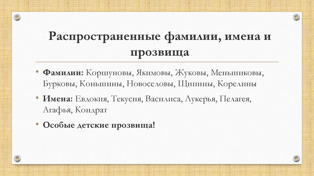 • Фамилии: Коршуновы, Якимовы, Жуковы, Меньшиковы,