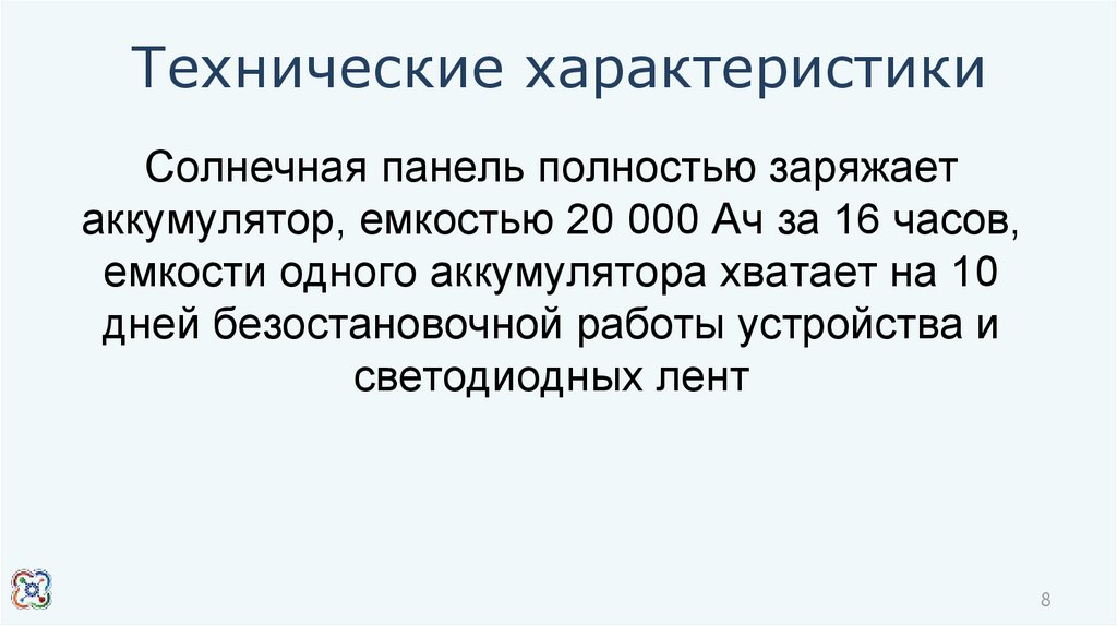 Технические характеристикиСолнечная панель полностью заряжает