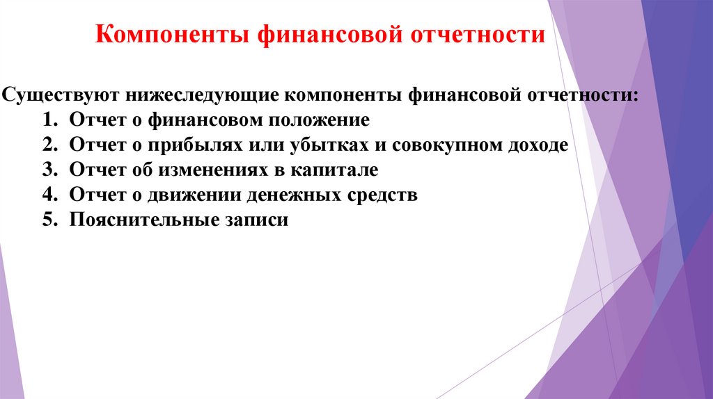 Компоненты финансовой отчетностиСуществуют нижеследующие компоненты финансовой отчетности: