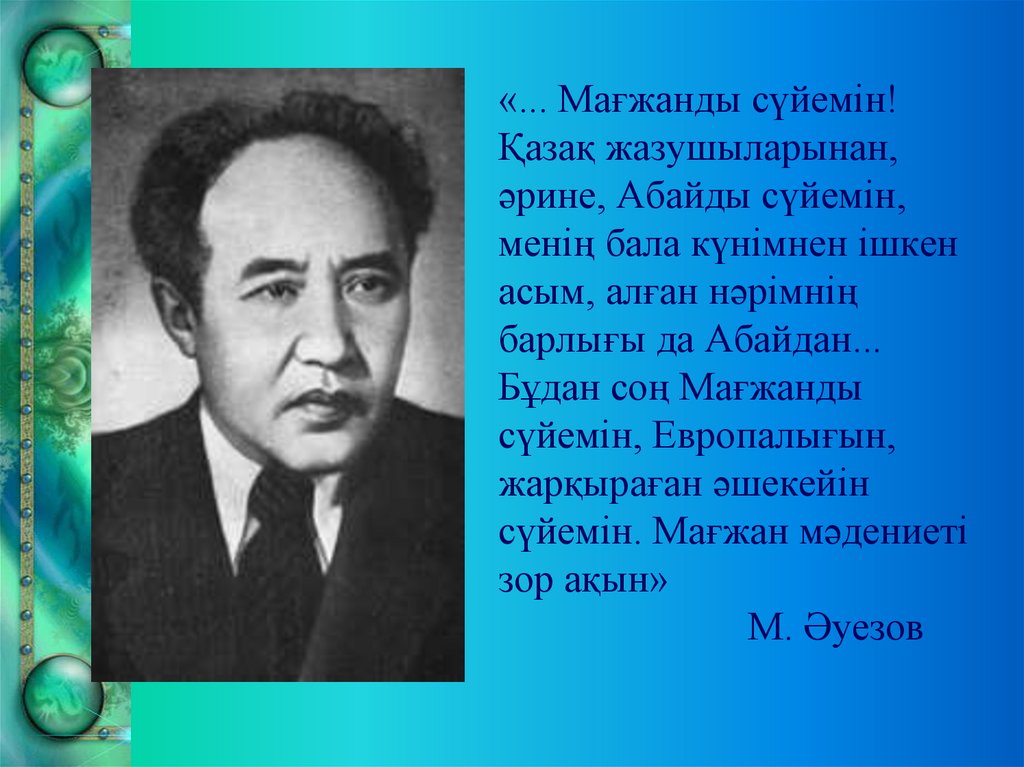 14. Мағжанның асыл ойлары 1. Білімдінің сөзі - ем, Мейірімі көп, өзі кең. 2. Сұм өмір абақты ғой саналыға.