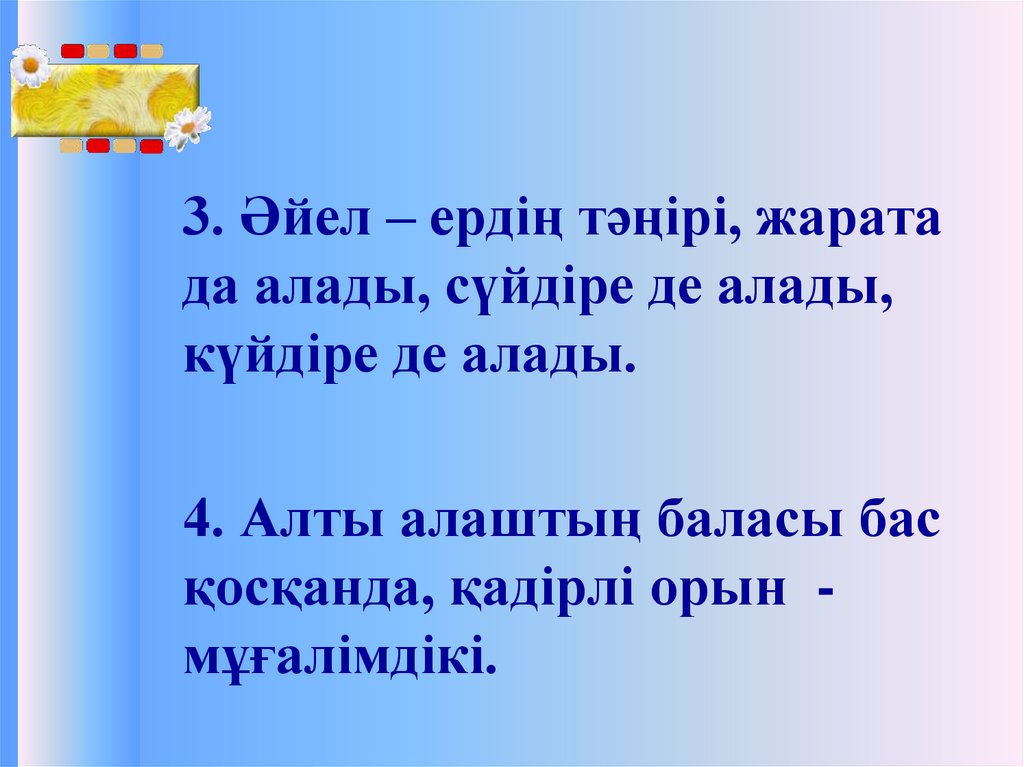 3. Әйел – ердің тәңірі, жаратада алады, сүйдіре де алады,
