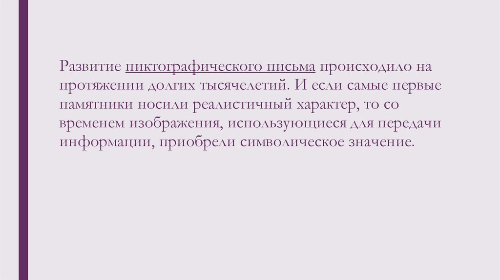 Развитие пиктографического письма происходило напротяжении долгих тысячелетий. И если самые первые